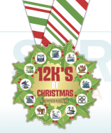 The custom designed 12K's Of Christmas Challenge medal (a huge 4 inch wreath) and all 12 days of Christmas magnets to add to your medal as you achieve your milestones.