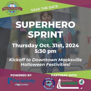 The Mocksville Superhero Sprint will be held in conjunction with Downtown Mocksville Halloween Festivities on Thursday, October 31st! This event will kick off downtown festivities for the evening once road closure takes place (race time approx. 5:30 pm).