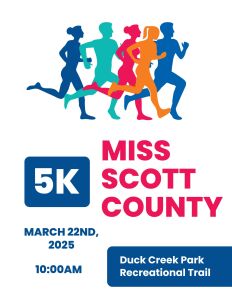 Miss Scott County 5k run/walk fundraiser! Enjoy a morning full of community, heart health, and fun. This flat, out and back course on the Duck Creek Recreational Trail will make for a quick and easy 5k! All proceeds from the race will go towards a scholarship for a high school student in Scott County.