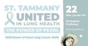 St. Tammany Health System, Presenting Sponsor, Chevron, and our host, the City of Covington, invite you to the 3rd Annual St. Tammany UNITED in Lung Health — Power of Pearl Lung Cancer Walk. Join survivors, and families and friends as they walk to promote lung cancer awareness or walk in memory of a loved one who harnessed the Power of Pearl during their journey. Enjoy inspirational survivor stories, live music, great food, and countless resources. In our Resource Village medical experts will provide education on lung cancer prevention; screening options to identify lung cancer in its early stages when survival rates are highest; and risk factors and screening options if you or a loved one is at high-risk for lung cancer.